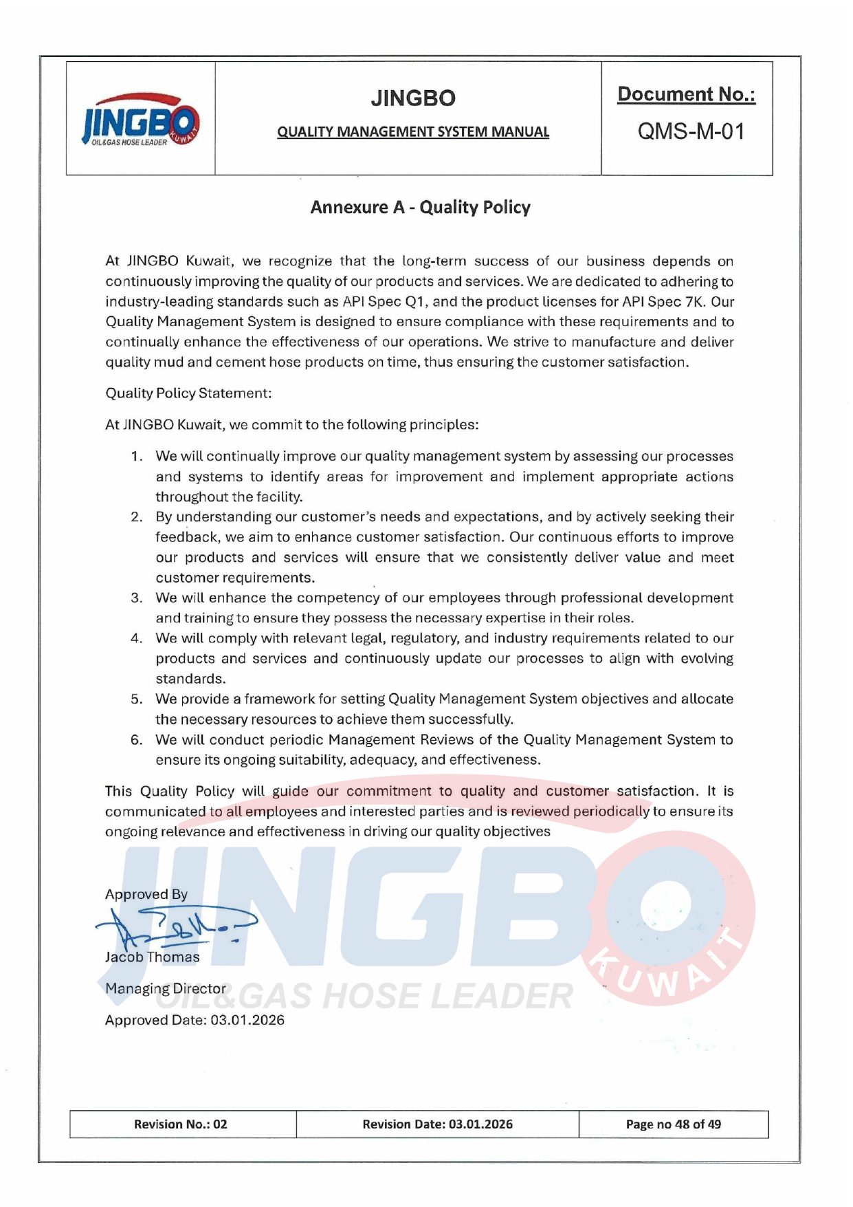 At Jingbo Kuwait, quality is a fundamental pillar of our operations. Our Quality Management System is developed and implemented in accordance with internationally recognized standards, including API Spec Q1, to ensure consistent delivery of reliable and high-performance products for the oil and gas industry.